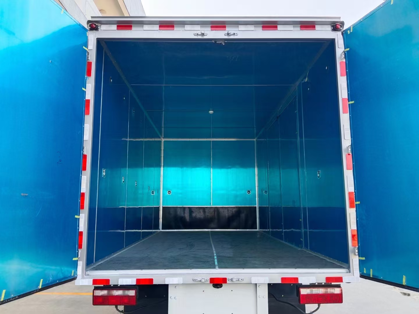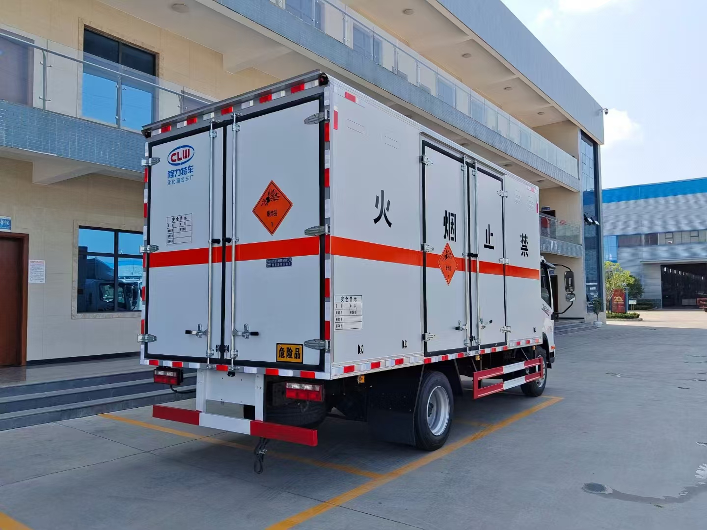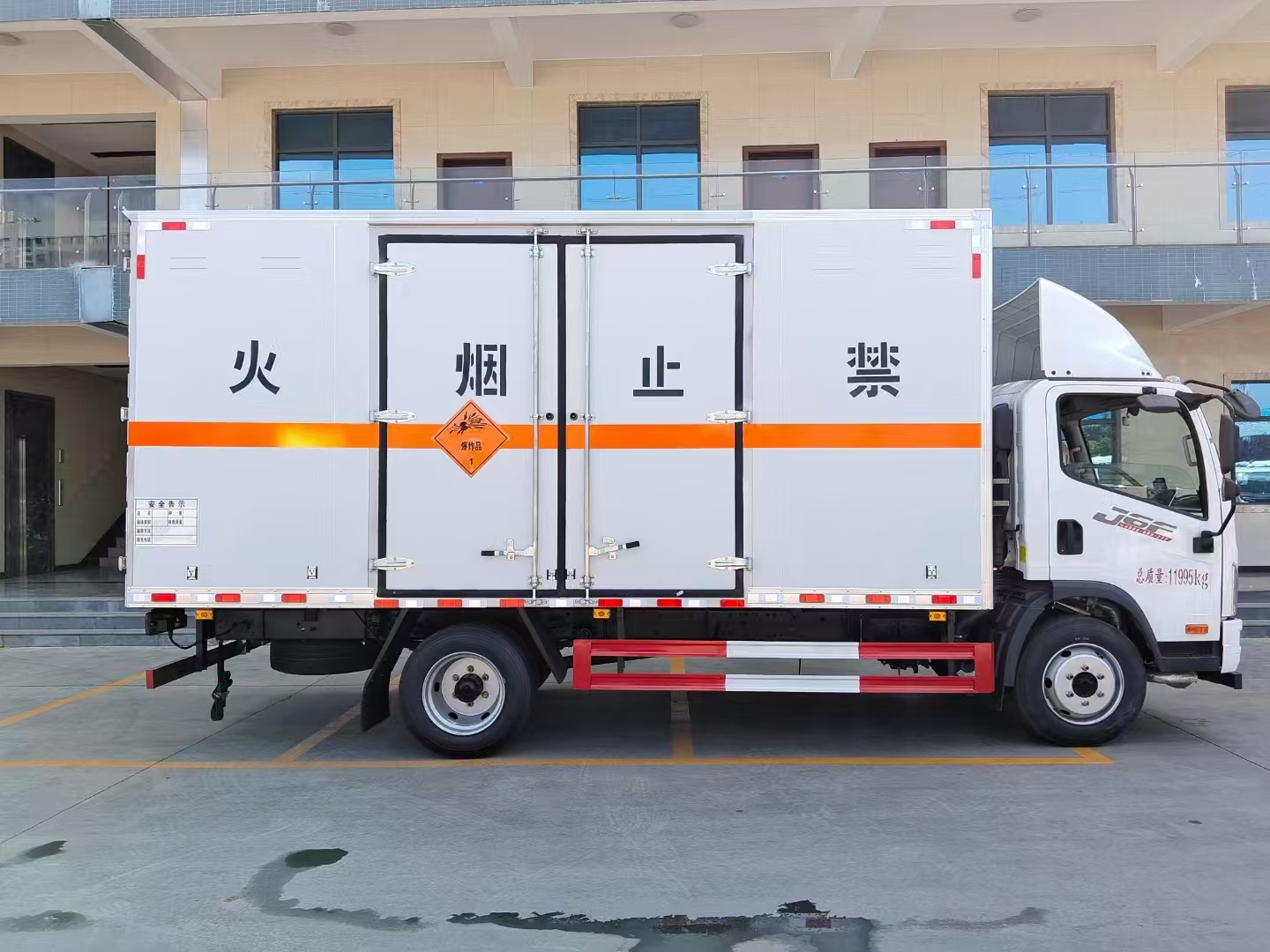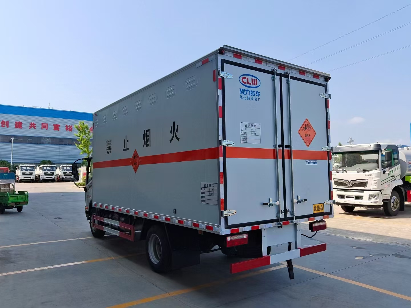 | 貨箱配置 | 廂體為雙層金屬骨架結構,外板采用冷軋鋼板,中間填充阻燃泡沫,內(nèi)飾為鋁板。底板為平板上鋪防靜電膠皮。廂內(nèi)兩側(cè)加裝固定貨物臥環(huán),門框帶防盜報警器,頂部帶煙霧報警器,廂體右側(cè)選裝側(cè)門,隨車配2個滅火器,危險標志牌,防火帽,危險品三角頂燈。 (尾部可選裝液壓升降尾板) | ||